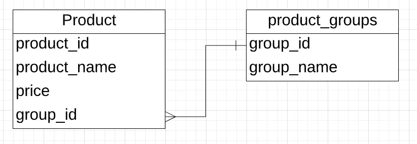 Tôi có 2 bảng dữ liệu products và product_groups có quan hệ 1-nhiều như sau: